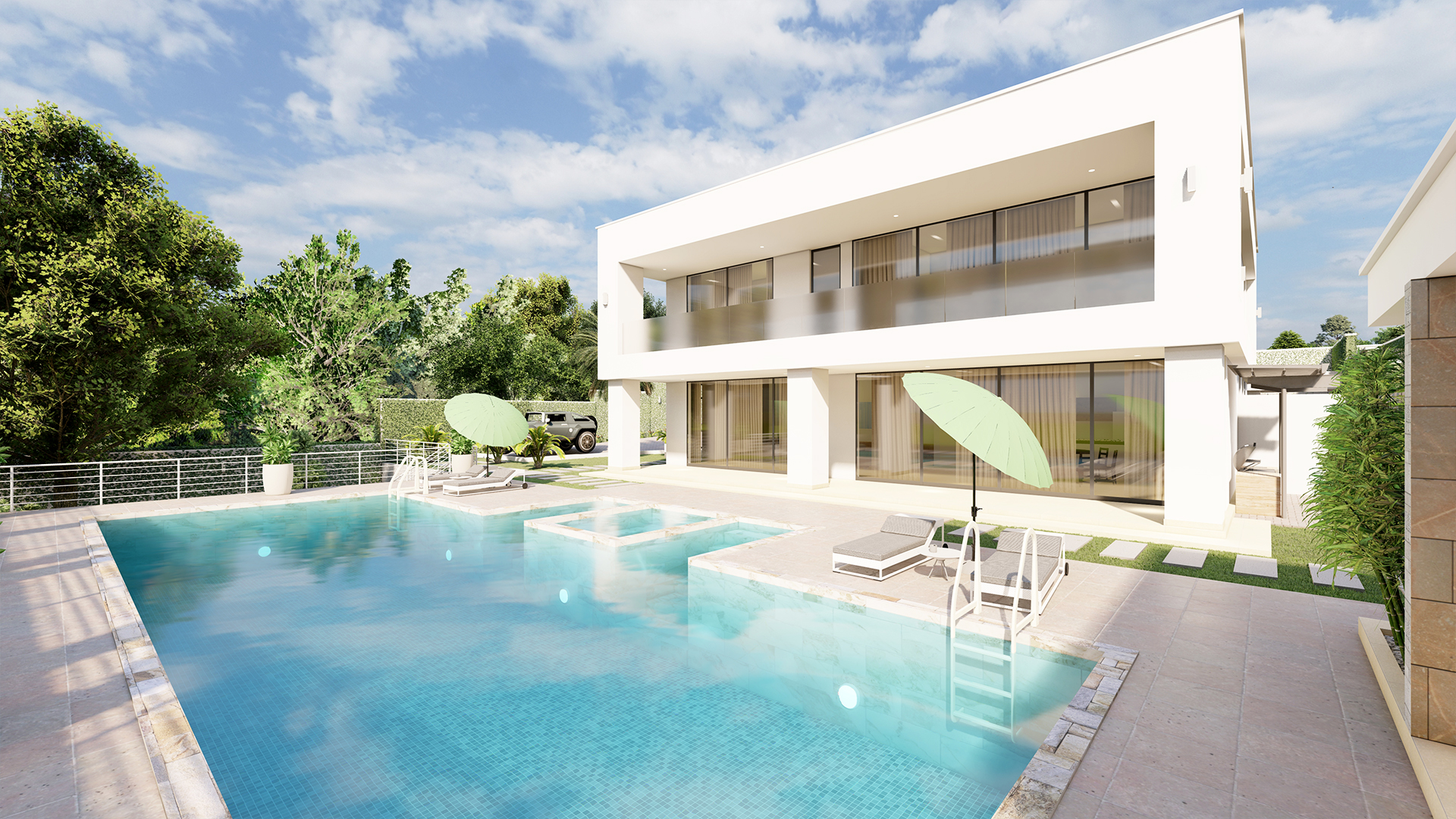 The scope includes a four-bedroom residence with supporting facilities and amenities.